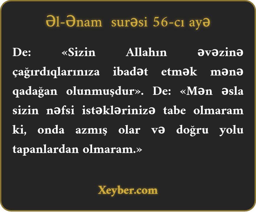 "De ki, mənə sizin Allah əvəzinə çağırdıqlarınıza pərəstiş qadağan olunmuşdur. De ki, mən sizin nəfs istəklərinizə tabe olmuram, çünki bu halda yolumu azıb, hidayət tapanlardan olmayacağam.”