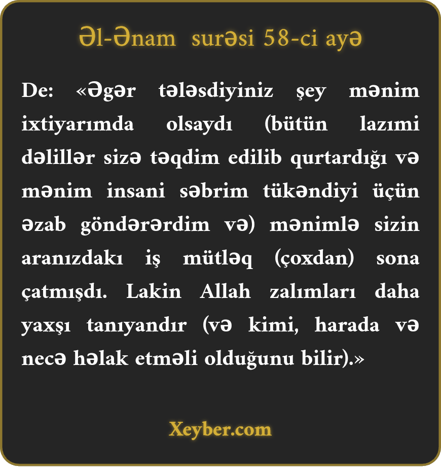 "De ki, əgər tələsərək istədiyiniz (şey) məndə olsaydı (sizin istəyinizlə əzab nazil edərdim), şübhəsiz, mənimlə sizin aranızda iş bitərdi. Amma Allah sitəmkarların halına daha agahdır (vaxtında cəzalandırır).”