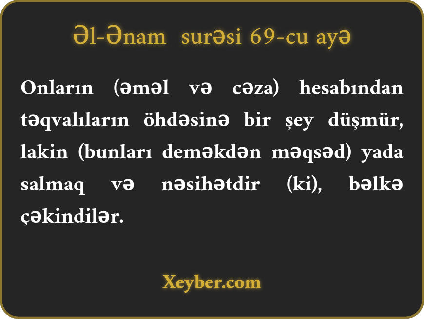 "Təqva yolunu seçənlər onların (sitəmkarların) günahına görə sorğuya çəkilməyəcəklər. Amma onlara nəsihət verməlidirlər ki, bəlkə təqvalılardan olalar.”