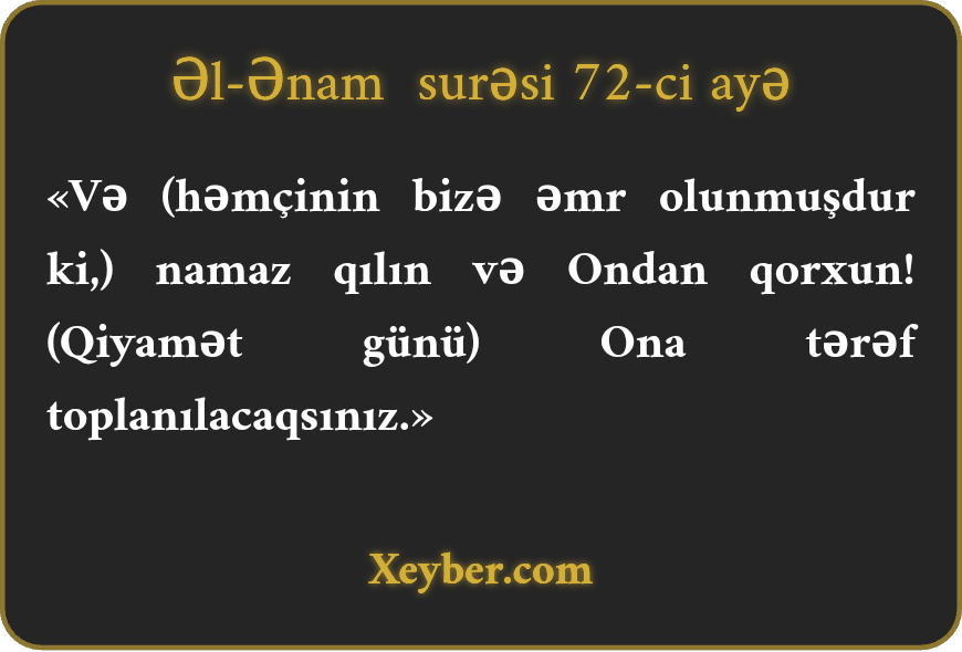"(Bizə əmr olunub ki,) namazı bərpa edək, Ondan (Allahdan) qorxaq. Hüzurunda hamının məhşur olacağı Odur.”
