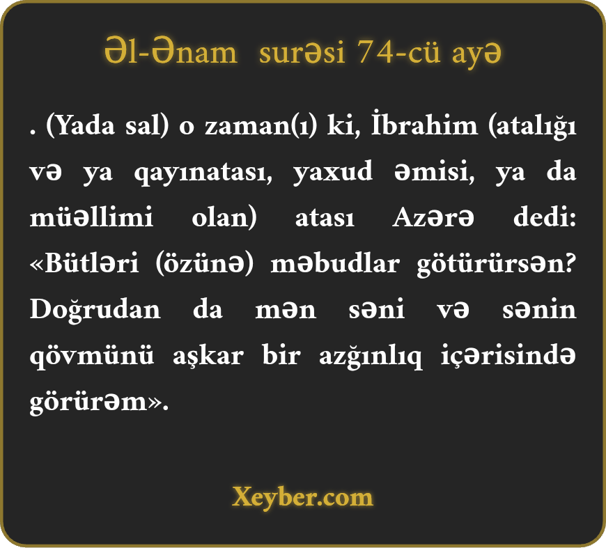 "(Xatırla) o zaman ki, İbrahim atası Azərə dedi: "Bütləri tanrımı tutursan? Şübhəsiz, səni və qövmünü aşkar azğınlıqda görürəm.”