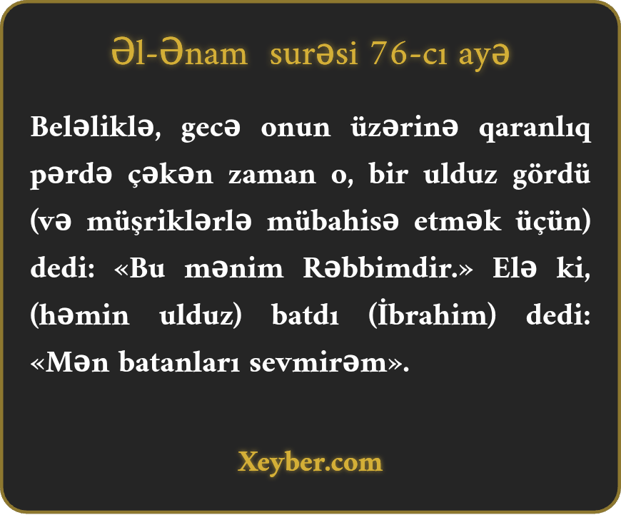 "Elə ki, gecə ona pərdə çəkdi, bir ulduz görüb dedi: "Bu, mənim Rəbbimdir.” Elə ki, (ulduz) qürub etdi, o dedi: "Mən zavala uğrayanları sevmirəm.”