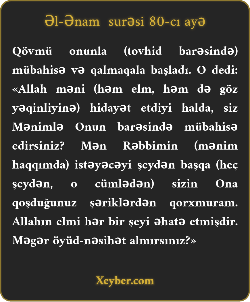 "Qövmü onunla danışıq və höcətləşməyə başladı. O dedi: "Yoxsa Allah haqqında mənimlə höcətləşirsiniz? Bir halda ki, O, məni hidayət etmişdir və mən sizin Ona şərik güman etdiklərinizdən qorxmuram. Allahımın istəyi istisnadır. (Hətta mənə bir zərər toxunsa, bütlərin yox, Allahın istəyidir.) Allahımın elmi hər şeyi əhatə etmişdir. Öyüd götürmürsünüzmü?”