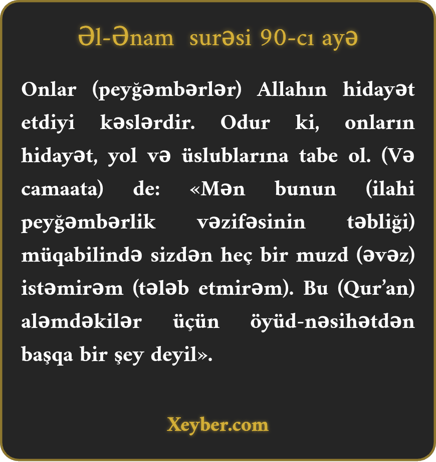 "Onlar Allahın hidayət etdiyi kəslərdir. Onun hidayətinə tabe ol. (Ey peyğəmbər! Xalqa) de ki, mən buna (risalət və dəvətə) görə sizdən muzd istəmirəm. Bu Quran yalnız aləmdəkilər üçün bir xəbərdarlıqdır. (Mənim istədiyim yalnız aləmdəkilərin öyüd götürməsidir.)”
