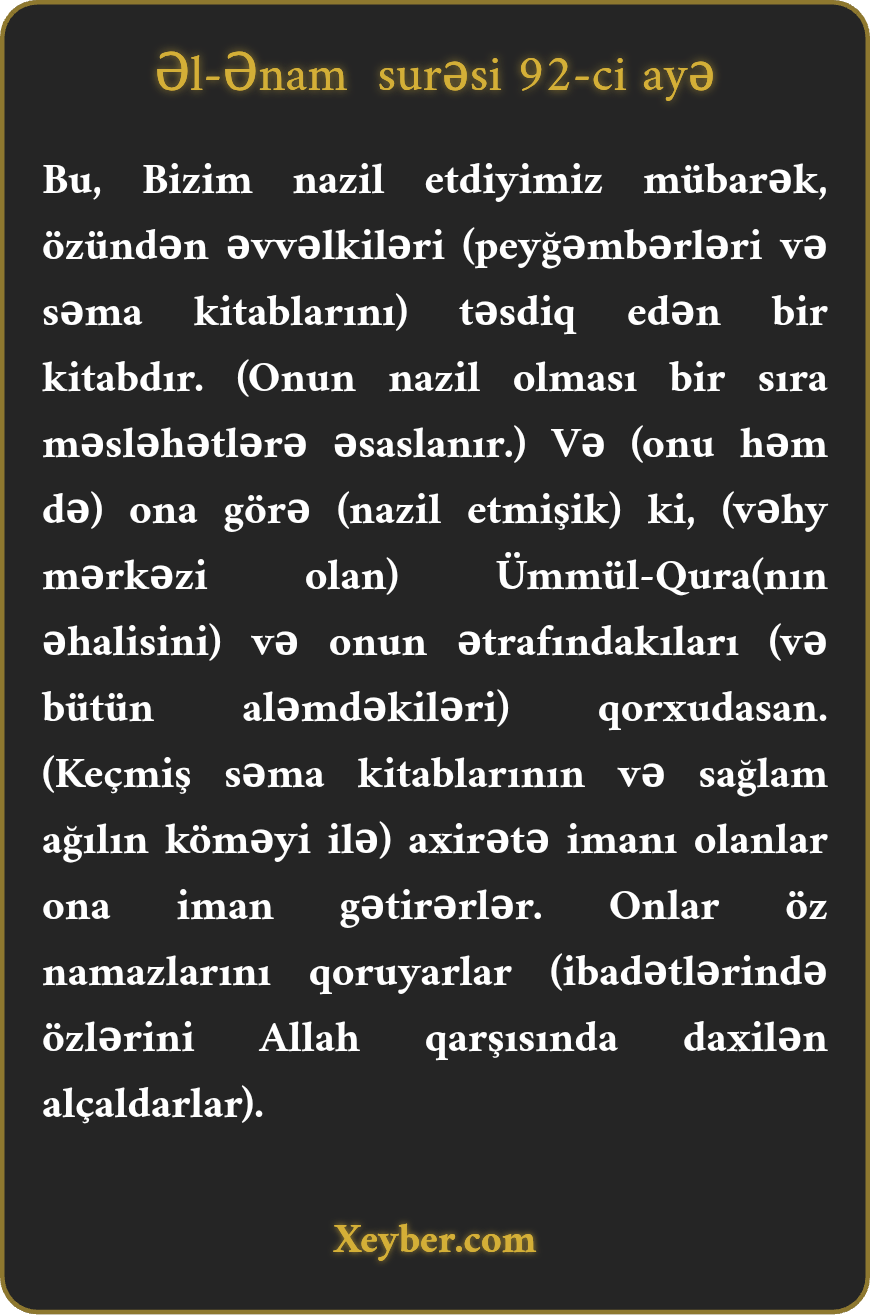 "Nazil etdiyimiz bu mübarək kitab özündən əvvəlkiləri (səmavi kitabları) təsdiq edəndir. (Xalqa ilahi mükafatlardan müjdə verir.) Məkkə əhli və onun ətrafında olan kəslərə xəbərdarlıq et. (Əlbəttə,) axirətə iman gətirənlər ona (Qurana) da iman gətirəcək. Onlar öz namazlarını hifz edirlər.”