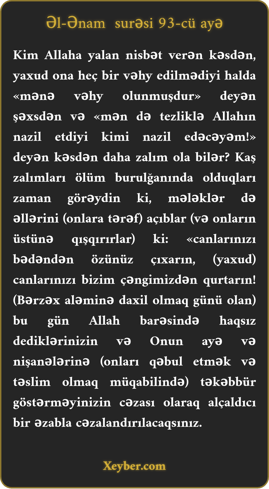 "Kimdir ondan da zalım ki, Allaha iftira yaxır və deyir: "Mənə vəhy olub.” Hansı ki, ona heç nə vəhy olunmayıb. Bir də o kəs ki, dedi: "Tezliklə mən də Allahın nazil etdiyi kimi bir şey nazil edərəm.” (Ey peyğəmbər,) bir zaman ki, zalımları ölüm yatağında çırpınan gördün, (ruhunu çıxarmaq üçün) mələklərin əllərini açdığına baxdın, o vaxt ki canın çıxma fərmanı verilir, (deyirlər,) bu gün sizə Allaha iftiralar yaxdığınız və Onun ayələrini ört-basdır etdiyiniz üçün zəliledici əzab veriləcək.”