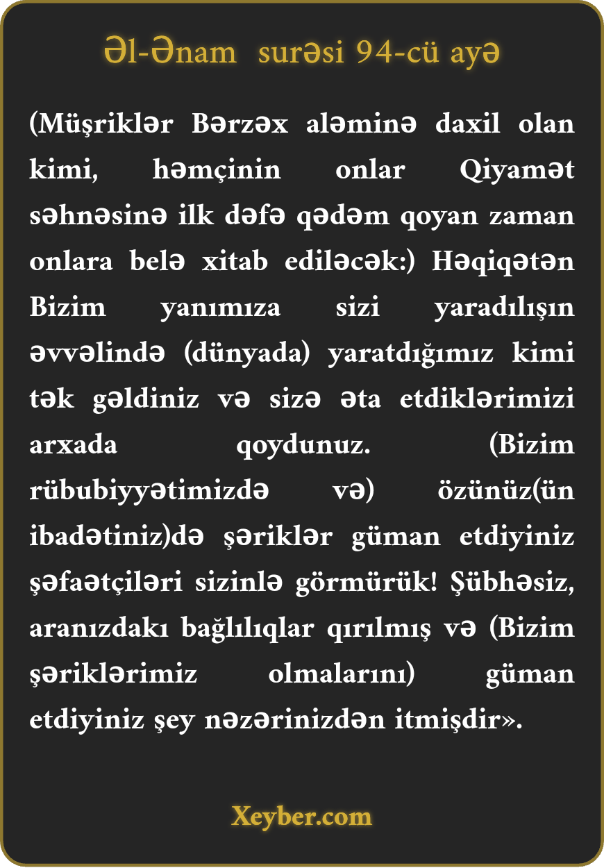 "Həqiqətən, sizi ilk dəfə yaratdığımız kimi indi də tək-tənha (ölüm zamanı və ya qiyamət anında) yanımıza gəldiniz. Sizə verdiyimiz bütün mal-mülkü arxada qoydunuz. (Taleyinizin təyinində) şəfaətçi olaraq Allaha şərik qoşduqlarınızı sizinlə birlikdə görmürük. Doğrusu aranızda (bağlar) qırılmışdır. (Şərik və şəfaətçi) güman etdikləriniz sizi qoyub getdi.”