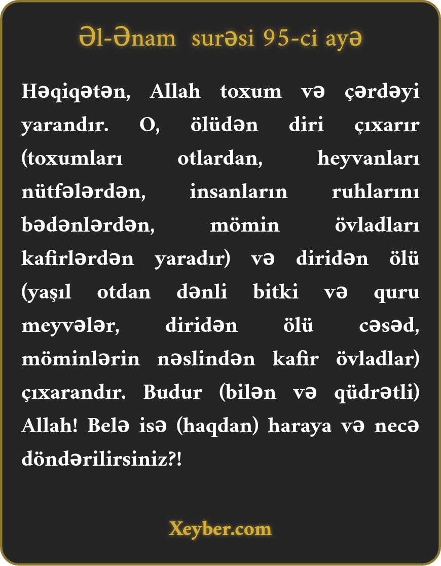 "Həqiqətən, Allah dən və toxumu çatladan, ölüdən diri çıxaran, diridən ölü çıxarandır. Odur sizin Allahınız. Bəs necə olur ki, (haqdan) azırsınız?”