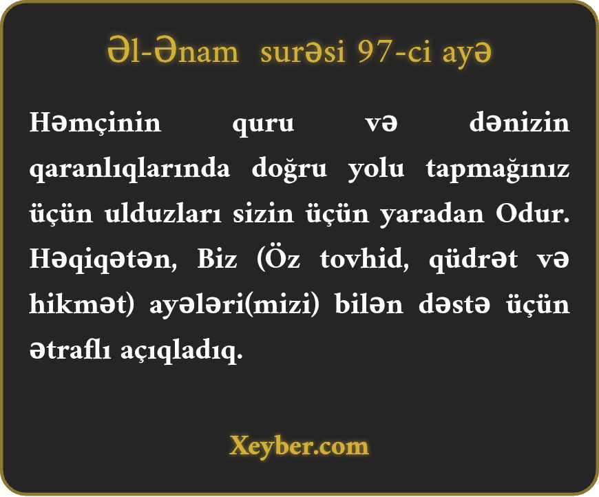 "Odur ulduzları sizin üçün qərarlaşdıran. (Bununla) quru və dəniz qaranlıqlarında onlar vasitəsi ilə yolu tapasınız (deyə). Şübhəsiz, Biz nişanələri agah və bilən bir qövm üçün ətraflı aydınlaşdırdıq.”