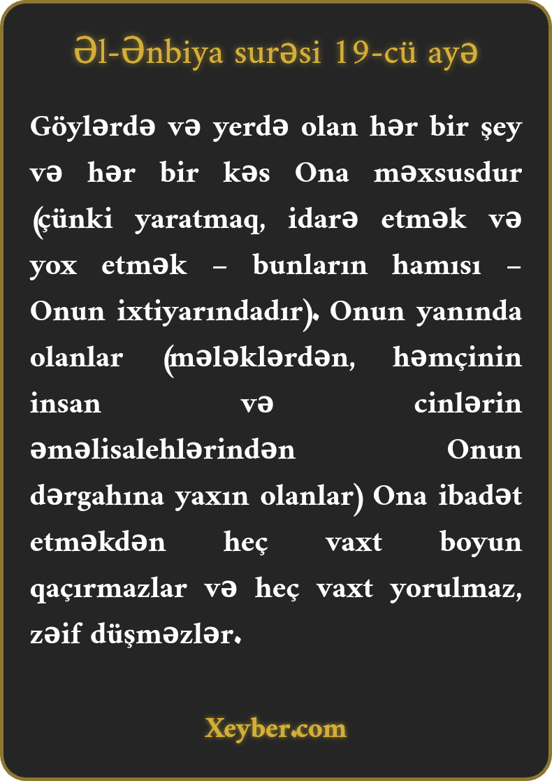 Göylərdə və yerdə olan hər bir şey və hər bir kəs Ona məxsusdur (çünki yaratmaq, idarə etmək və yox etmək – bunların hamısı – Onun ixtiyarındadır). Onun yanında olanlar (mələklərdən, həmçinin insan və cinlərin əməlisalehlərindən Onun dərgahına yaxın olanlar) Ona ibadət etməkdən heç vaxt boyun qaçırmazlar və heç vaxt yorulmaz, zəif düşməzlər.