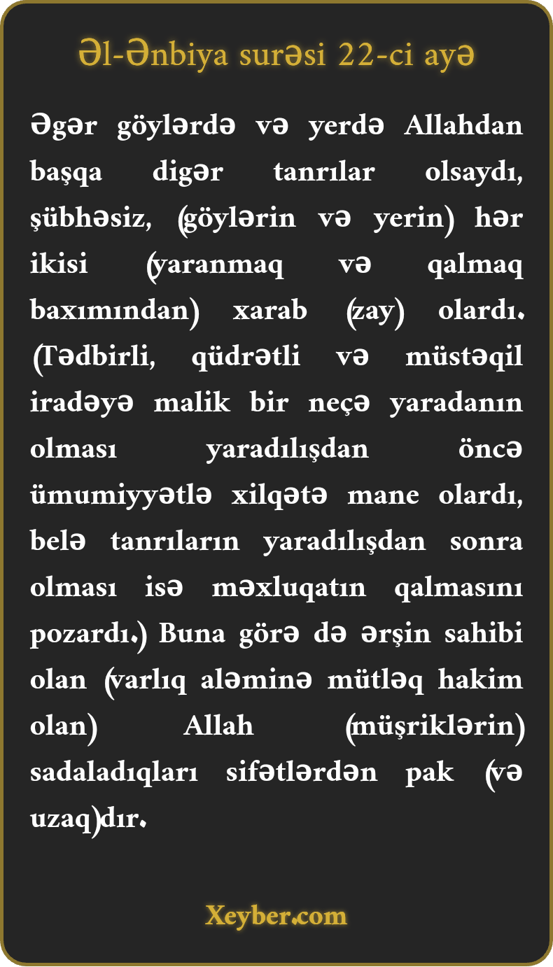 Əgər göylərdə və yerdə Allahdan başqa digər tanrılar olsaydı, şübhəsiz, (göylərin və yerin) hər ikisi (yaranmaq və qalmaq baxımından) xarab (zay) olardı. (Tədbirli, qüdrətli və müstəqil iradəyə malik bir neçə yaradanın olması yaradılışdan öncə ümumiyyətlə xilqətə mane olardı, belə tanrıların yaradılışdan sonra olması isə məxluqatın qalmasını pozardı.) Buna görə də ərşin sahibi olan (varlıq aləminə mütləq hakim olan) Allah (müşriklərin) sadaladıqları sifətlərdən pak (və uzaq)dır.