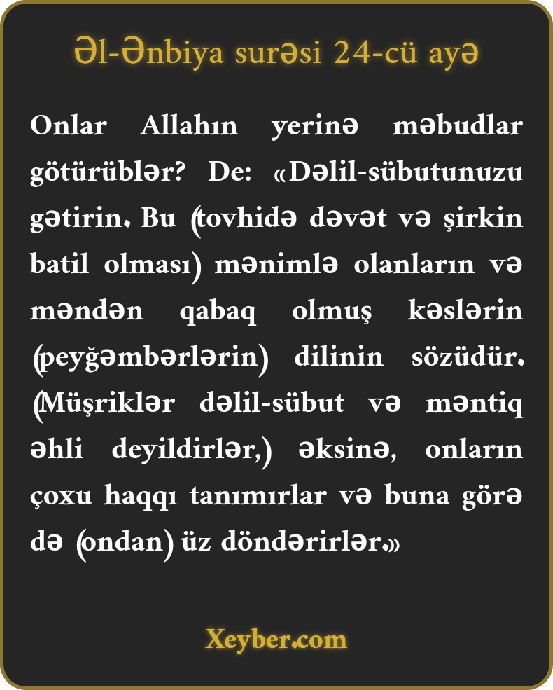 Onlar Allahın yerinə məbudlar götürüblər? De: «Dəlil-sübutunuzu gətirin. Bu (tovhidə dəvət və şirkin batil olması) mənimlə olanların və məndən qabaq olmuş kəslərin (peyğəmbərlərin) dilinin sözüdür. (Müşriklər dəlil-sübut və məntiq əhli deyildirlər,) əksinə, onların çoxu haqqı tanımırlar və buna görə də (ondan) üz döndərirlər.»