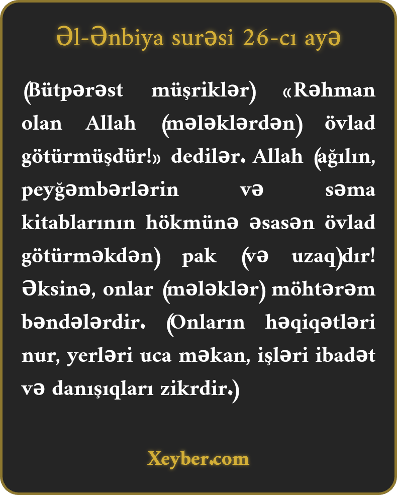 (Bütpərəst müşriklər) «Rəhman olan Allah (mələklərdən) övlad götürmüşdür!» dedilər. Allah (ağılın, peyğəmbərlərin və səma kitablarının hökmünə əsasən övlad götürməkdən) pak (və uzaq)dır! Əksinə, onlar (mələklər) möhtərəm bəndələrdir. (Onların həqiqətləri nur, yerləri uca məkan, işləri ibadət və danışıqları zikrdir.)