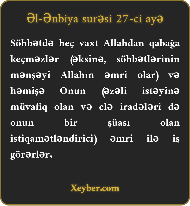 Söhbətdə heç vaxt Allahdan qabağa keçməzlər (əksinə, söhbətlərinin mənşəyi Allahın əmri olar) və həmişə Onun (əzəli istəyinə müvafiq olan və elə iradələri də onun bir şüası olan istiqamətləndirici) əmri ilə iş görərlər.
