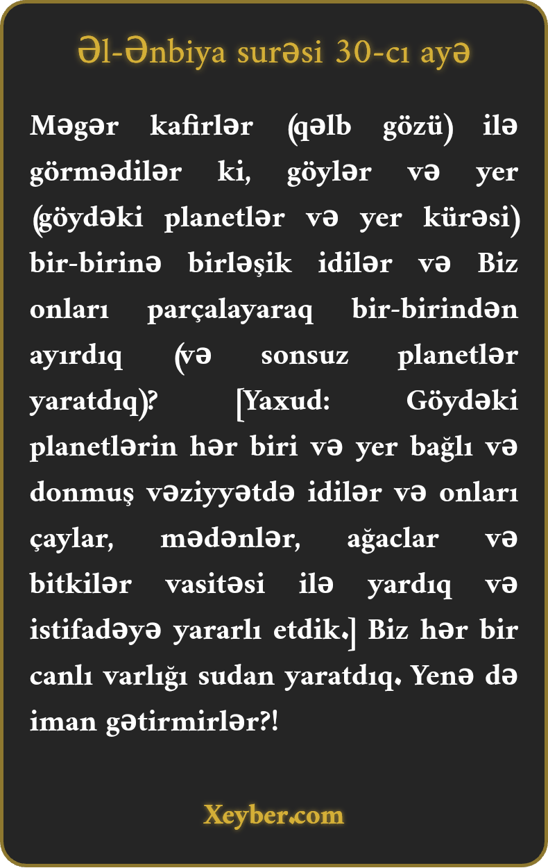 Məgər kafirlər (qəlb gözü) ilə görmədilər ki, göylər və yer (göydəki planetlər və yer kürəsi) bir-birinə birləşik idilər və Biz onları parçalayaraq bir-birindən ayırdıq (və sonsuz planetlər yaratdıq)? [Yaxud: Göydəki planetlərin hər biri və yer bağlı və donmuş vəziyyətdə idilər və onları çaylar, mədənlər, ağaclar və bitkilər vasitəsi ilə yardıq və istifadəyə yararlı etdik.] Biz hər bir canlı varlığı sudan yaratdıq. Yenə də iman gətirmirlər?!