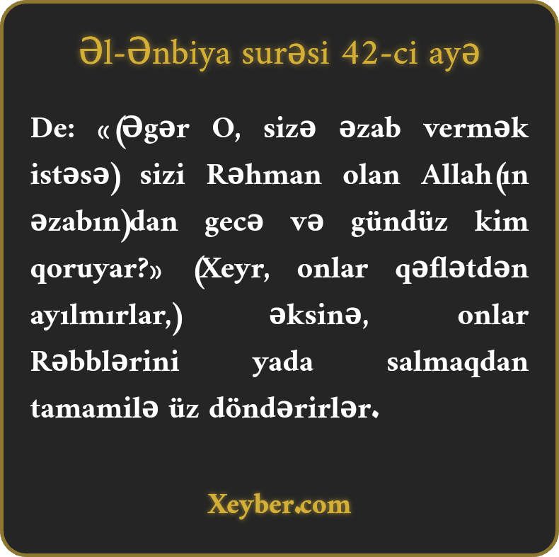 De: «(Əgər O, sizə əzab vermək istəsə) sizi Rəhman olan Allah(ın əzabın)dan gecə və gündüz kim qoruyar?» (Xeyr, onlar qəflətdən ayılmırlar,) əksinə, onlar Rəbblərini yada salmaqdan tamamilə üz döndərirlər.