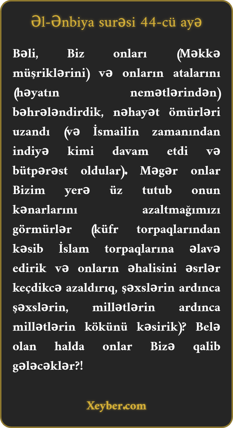Bəli, Biz onları (Məkkə müşriklərini) və onların atalarını (həyatın nemətlərindən) bəhrələndirdik, nəhayət ömürləri uzandı (və İsmailin zamanından indiyə kimi davam etdi və bütpərəst oldular). Məgər onlar Bizim yerə üz tutub onun kənarlarını azaltmağımızı görmürlər (küfr torpaqlarından kəsib İslam torpaqlarına əlavə edirik və onların əhalisini əsrlər keçdikcə azaldırıq, şəxslərin ardınca şəxslərin, millətlərin ardınca millətlərin kökünü kəsirik)? Belə olan halda onlar Bizə qalib gələcəklər?!