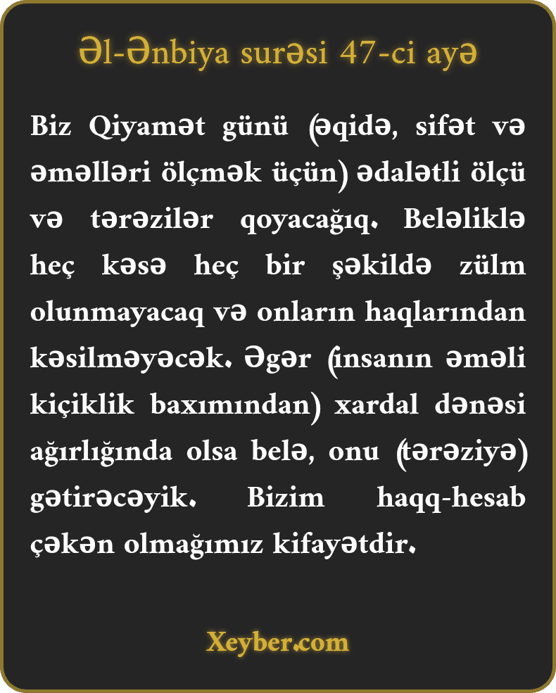 Biz Qiyamət günü (əqidə, sifət və əməlləri ölçmək üçün) ədalətli ölçü və tərəzilər qoyacağıq. Beləliklə heç kəsə heç bir şəkildə zülm olunmayacaq və onların haqlarından kəsilməyəcək. Əgər (insanın əməli kiçiklik baxımından) xardal dənəsi ağırlığında olsa belə, onu (tərəziyə) gətirəcəyik. Bizim haqq-hesab çəkən olmağımız kifayətdir.
