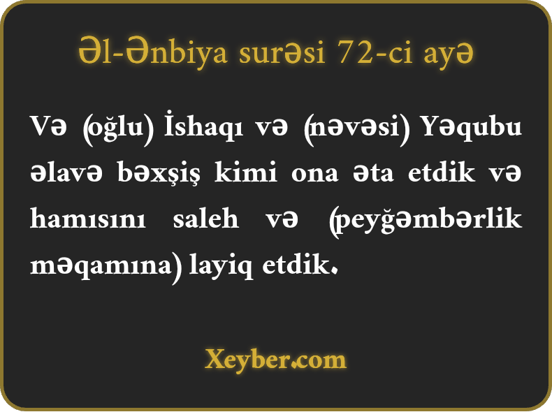 Və (oğlu) İshaqı və (nəvəsi) Yəqubu əlavə bəxşiş kimi ona əta etdik və hamısını saleh və (peyğəmbərlik məqamına) layiq etdik.