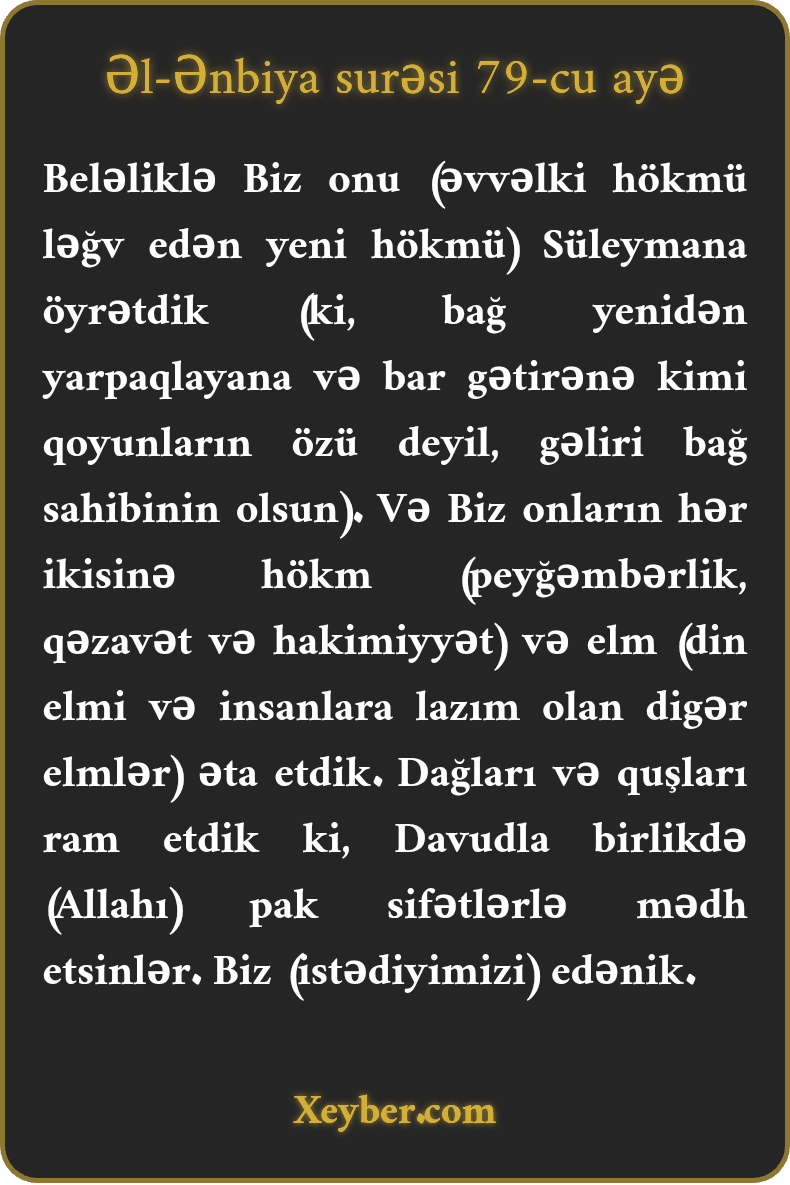 Beləliklə Biz onu (əvvəlki hökmü ləğv edən yeni hökmü) Süleymana öyrətdik (ki, bağ yenidən yarpaqlayana və bar gətirənə kimi qoyunların özü deyil, gəliri bağ sahibinin olsun). Və Biz onların hər ikisinə hökm (peyğəmbərlik, qəzavət və hakimiyyət) və elm (din elmi və insanlara lazım olan digər elmlər) əta etdik. Dağları və quşları ram etdik ki, Davudla birlikdə (Allahı) pak sifətlərlə mədh etsinlər. Biz (istədiyimizi) edənik.