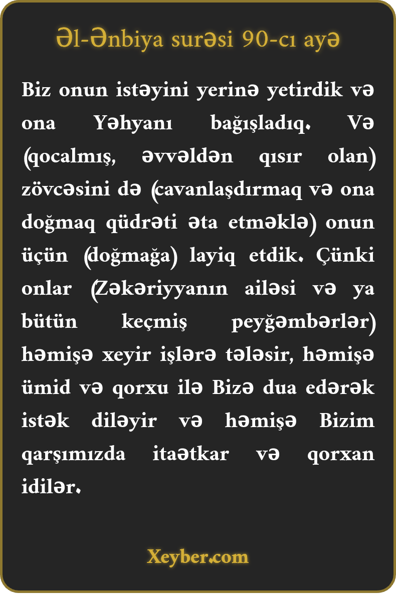 Biz onun istəyini yerinə yetirdik və ona Yəhyanı bağışladıq. Və (qocalmış, əvvəldən qısır olan) zövcəsini də (cavanlaşdırmaq və ona doğmaq qüdrəti əta etməklə) onun üçün (doğmağa) layiq etdik. Çünki onlar (Zəkəriyyanın ailəsi və ya bütün keçmiş peyğəmbərlər) həmişə xeyir işlərə tələsir, həmişə ümid və qorxu ilə Bizə dua edərək istək diləyir və həmişə Bizim qarşımızda itaətkar və qorxan idilər.