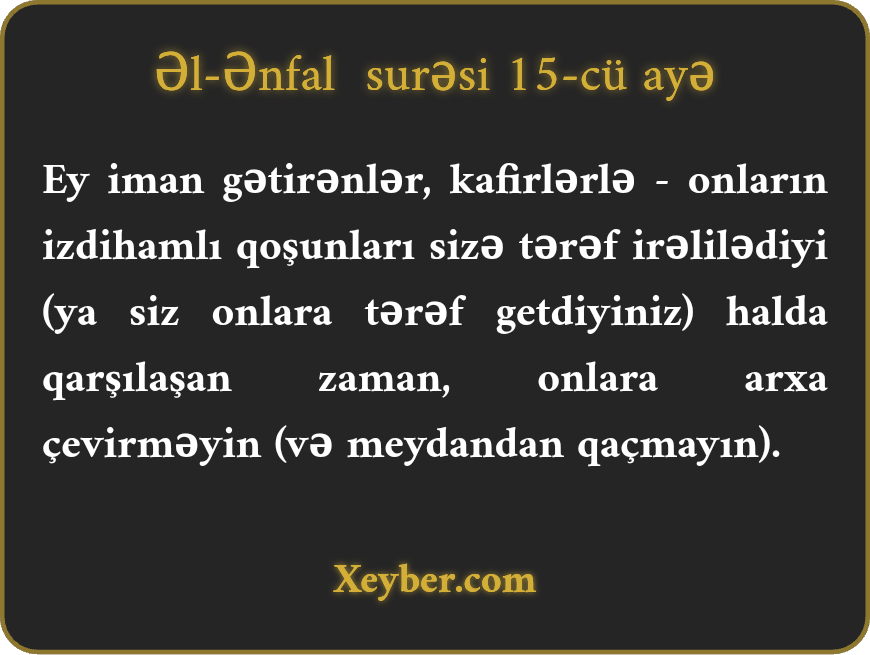 "Еy imаn gәtirәnlәr! Әgәr kаfir dәstәsi ilә rаstlаşsаnız, оnlаrа аrха çеvirmәyin, qаçmаyın.”