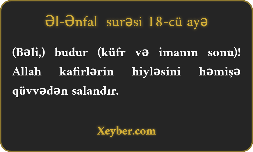 "Оdur (düşmәnin mәğlubiyyәti, sizin qәlәbәniz vә Аllаhın lütfü). (Bilin ki,) Аllаh kаfirlәrin hiylәsini zәiflәdәndir.”