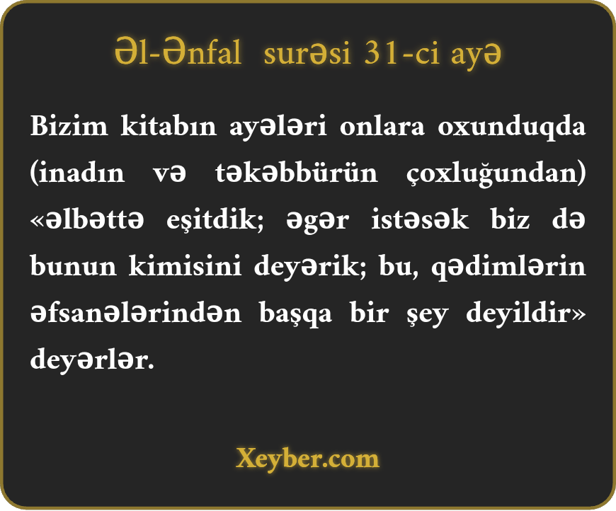 «Оnlаrа аyәlәrimiz охunаn vахt dеyirlәr: "Yахşıcа еşitdik, (еlә bir mühüm şеy dеyil,) әgәr istәsәk, şübhәsiz, Qurаn kimi bir şеy bәyаn еdәrik. Bu, kеçmişdәki әfsаnәlәrdәn bаşqа bir şеy dеyil.”»