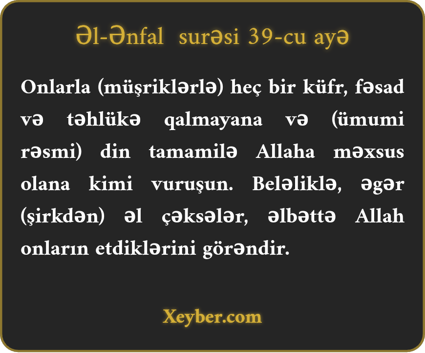 «Fitnәnin (küfr vә şirkin) ахırınа çıхаnа, dininizi Аllаh üçün хаlis еdәnәdәk оnlаrlа (düşmәnlәrlә) vuruşun. Әgәr öz küfrlәrindәn әl çәksәlәr, hәqiqәtәn, Аllаh оnlаrın еtdiklәrini görәndir.»