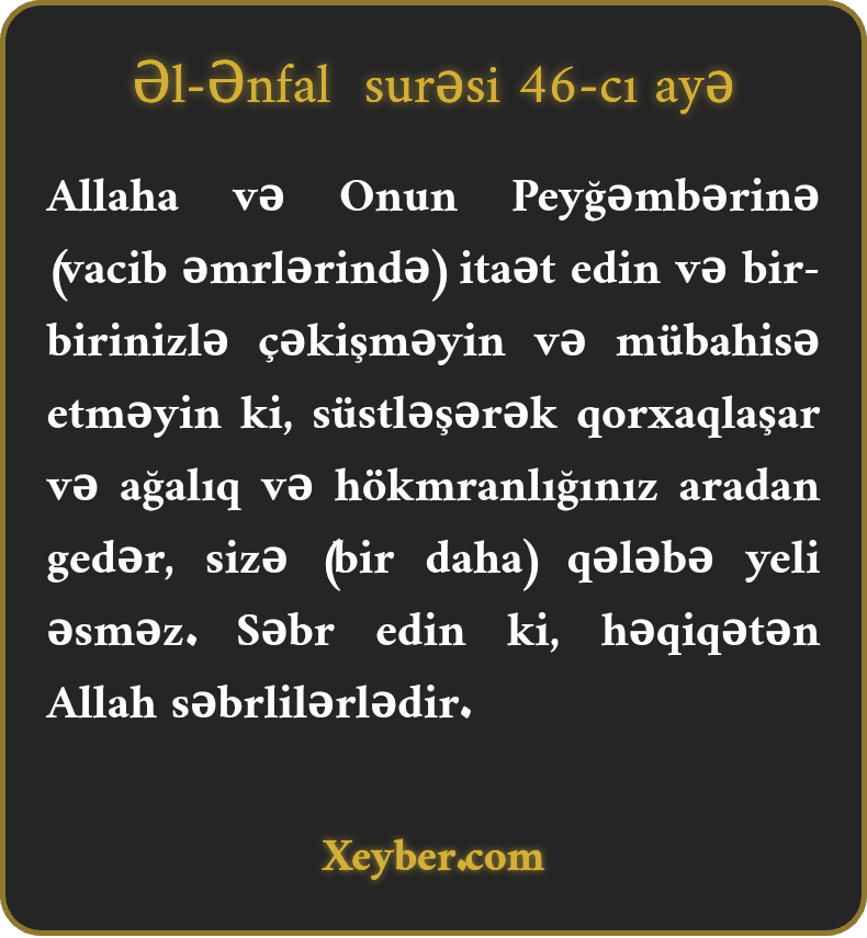 "Аllаhа vә Оnun rәsulunа itаәt еdin. Bir birinizlә çәkişmәyin ki, süstlәşәrsiniz, şövkәt vә qüvvәniz аrаdаn götürülәr. Sәbir еdin. Hәqiqәtәn, Аllаh sәbir еdәnlәrlәdir.”