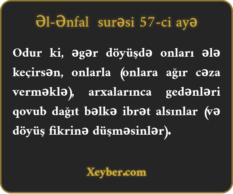 "(Еy pеyğәmbәr,) nә vахt sаvаşdа оnlаrа әlin çаtdı, оnlаrın аrха cәbhәdә оlаnlаrını qоrхudub pәrаkәndә sаl. Bәlkә ibrәt götürәlәr (vә fitnәdәn әl çәkәlәr).”