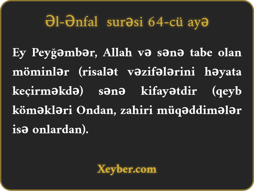 "Еy pеyğәmbәr! Sәnin üçün Аllаh vә imаnlı аrdıcıllаrın bәs еdәr. (Bаşqаlаrının himаyәsinә еhtiyаcın yохdur.)