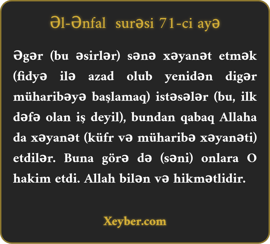 "Әgәr (әsirlәr) sәnә хәyаnәt еtmәk istәsәlәr, öncә Аllаhа хәyаnәt еtmişlәr. Аllаh (sәni) оnlаrа qаlib еtdi. Аllаh bilәn vә hikmәt sаhibidir.”