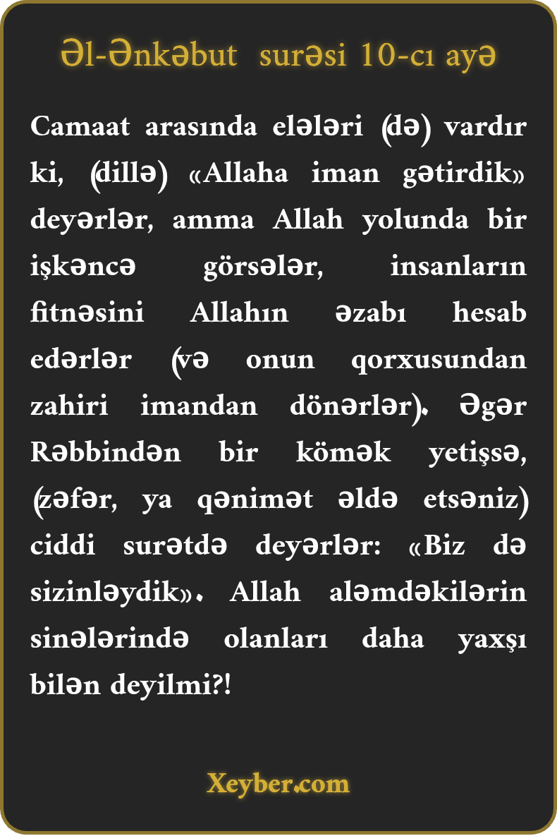 Camaat arasında elələri (də) vardır ki, (dillə) «Allaha iman gətirdik» deyərlər, amma Allah yolunda bir işkəncə görsələr, insanların fitnəsini Allahın əzabı hesab edərlər (və onun qorxusundan zahiri imandan dönərlər). Əgər Rəbbindən bir kömək yetişsə, (zəfər, ya qənimət əldə etsəniz) ciddi surətdə deyərlər: «Biz də sizinləydik». Allah aləmdəkilərin sinələrində olanları daha yaxşı bilən deyilmi?!