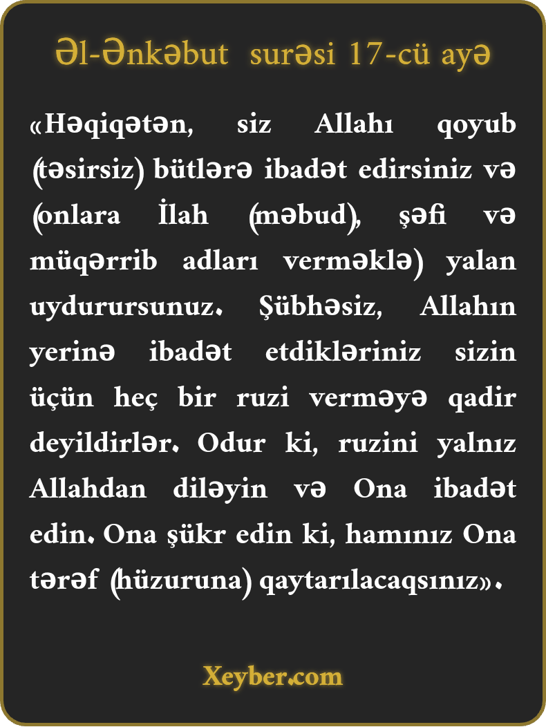 «Həqiqətən, siz Allahı qoyub (təsirsiz) bütlərə ibadət edirsiniz və (məbud">(onlara İlah (məbud), şəfi və müqərrib adları verməklə) yalan uydurursunuz. Şübhəsiz, Allahın yerinə ibadət etdikləriniz sizin üçün heç bir ruzi verməyə qadir deyildirlər. Odur ki, ruzini yalnız Allahdan diləyin və Ona ibadət edin. Ona şükr edin ki, hamınız Ona tərəf (hüzuruna) qaytarılacaqsınız».