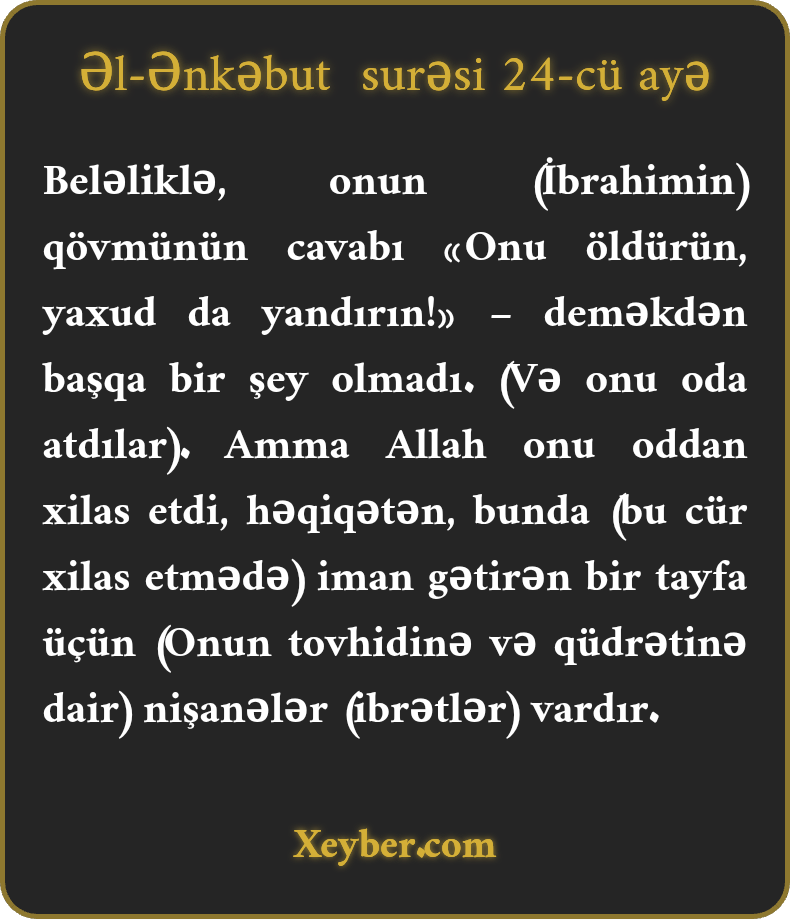Beləliklə, onun (İbrahimin) qövmünün cavabı «Onu öldürün, yaxud da yandırın!» – deməkdən başqa bir şey olmadı. (Və onu oda atdılar). Amma Allah onu oddan xilas etdi, həqiqətən, bunda (bu cür xilas etmədə) iman gətirən bir tayfa üçün (Onun tovhidinə və qüdrətinə dair) nişanələr (ibrətlər) vardır.