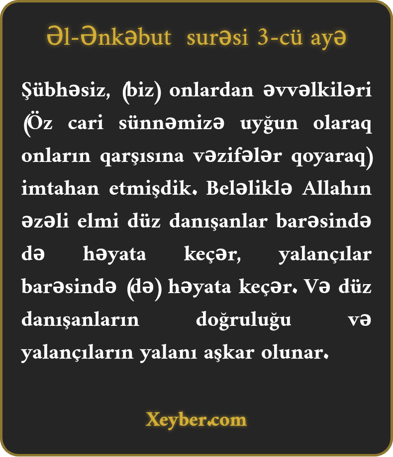 Şübhəsiz, (biz) onlardan əvvəlkiləri (Öz cari sünnəmizə uyğun olaraq onların qarşısına vəzifələr qoyaraq) imtahan etmişdik. Beləliklə Allahın əzəli elmi düz danışanlar barəsində də həyata keçər, yalançılar barəsində (də) həyata keçər. Və düz danışanların doğruluğu və yalançıların yalanı aşkar olunar.