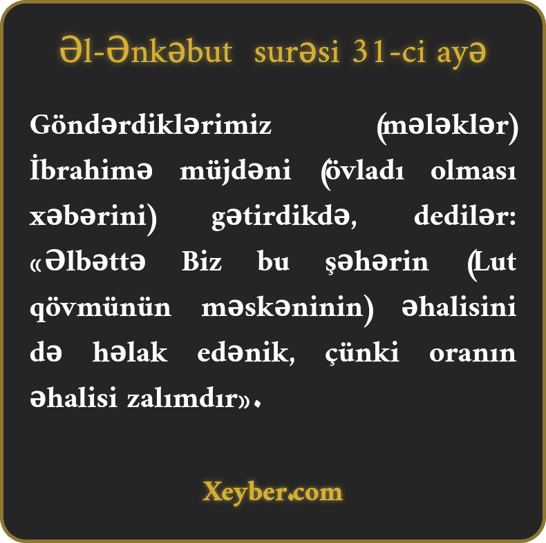 Göndərdiklərimiz (mələklər) İbrahimə müjdəni (övladı olması xəbərini) gətirdikdə, dedilər: «Əlbəttə Biz bu şəhərin (Lut qövmünün məskəninin) əhalisini də həlak edənik, çünki oranın əhalisi zalımdır».