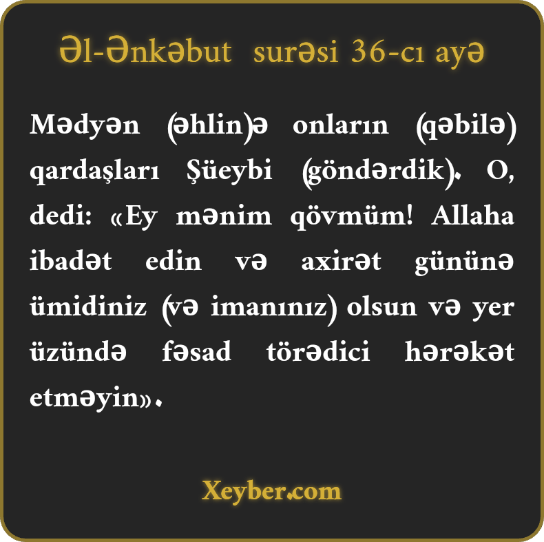 Mədyən (əhlin)ə onların (qəbilə) qardaşları Şüeybi (göndərdik). O, dedi: «Ey mənim qövmüm! Allaha ibadət edin və axirət gününə ümidiniz (və imanınız) olsun və yer üzündə fəsad törədici hərəkət etməyin».