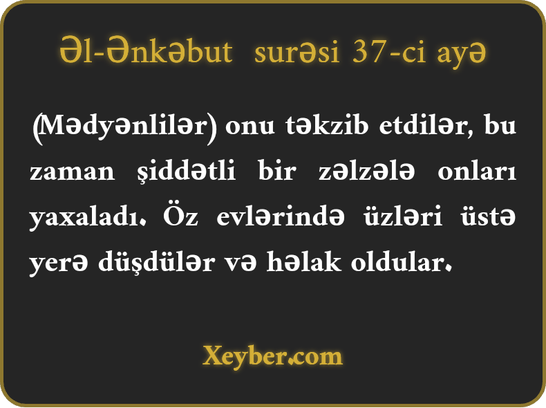 (Mədyənlilər) onu təkzib etdilər, bu zaman şiddətli bir zəlzələ onları yaxaladı. Öz evlərində üzləri üstə yerə düşdülər və həlak oldular.