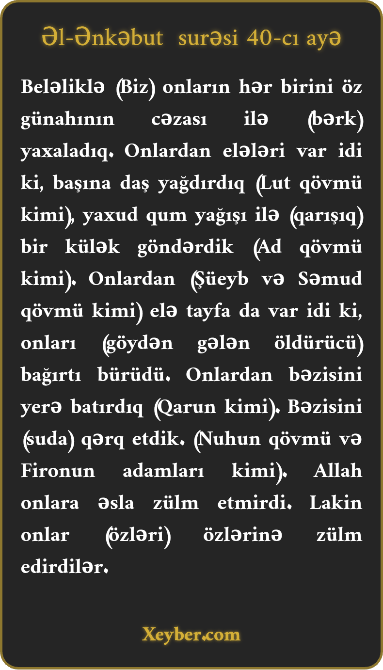 Beləliklə (Biz) onların hər birini öz günahının cəzası ilə (bərk) yaxaladıq. Onlardan elələri var idi ki, başına daş yağdırdıq (Lut qövmü kimi), yaxud qum yağışı ilə (qarışıq) bir külək göndərdik (Ad qövmü kimi). Onlardan (Şüeyb və Səmud qövmü kimi) elə tayfa da var idi ki, onları (göydən gələn öldürücü) bağırtı bürüdü. Onlardan bəzisini yerə batırdıq (Qarun kimi). Bəzisini (suda) qərq etdik. (Nuhun qövmü və Fironun adamları kimi). Allah onlara əsla zülm etmirdi. Lakin onlar (özləri) özlərinə zülm edirdilər.