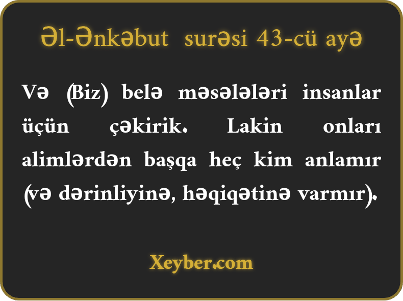 Və (Biz) belə məsələləri insanlar üçün çəkirik. Lakin onları alimlərdən başqa heç kim anlamır (və dərinliyinə, həqiqətinə varmır).