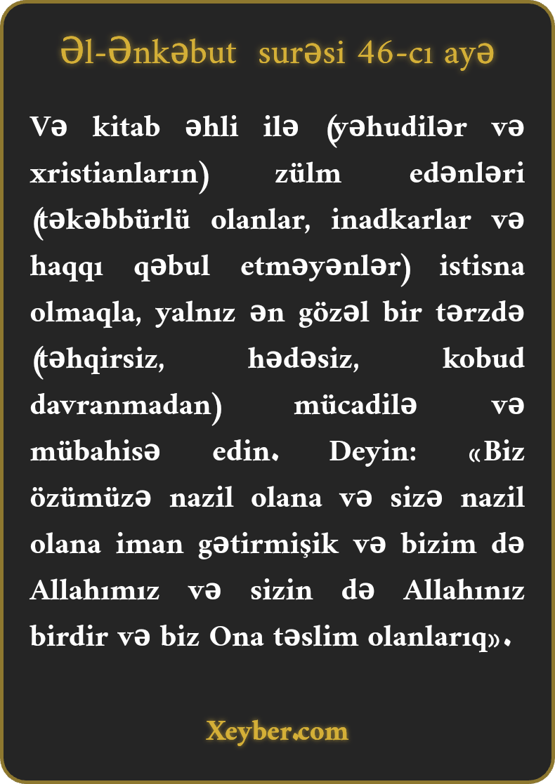 Və kitab əhli ilə (yəhudilər və xristianların) zülm edənləri (təkəbbürlü olanlar, inadkarlar və haqqı qəbul etməyənlər) istisna olmaqla, yalnız ən gözəl bir tərzdə (təhqirsiz, hədəsiz, kobud davranmadan) mücadilə və mübahisə edin. Deyin: «Biz özümüzə nazil olana və sizə nazil olana iman gətirmişik və bizim də Allahımız və sizin də Allahınız birdir və biz Ona təslim olanlarıq».