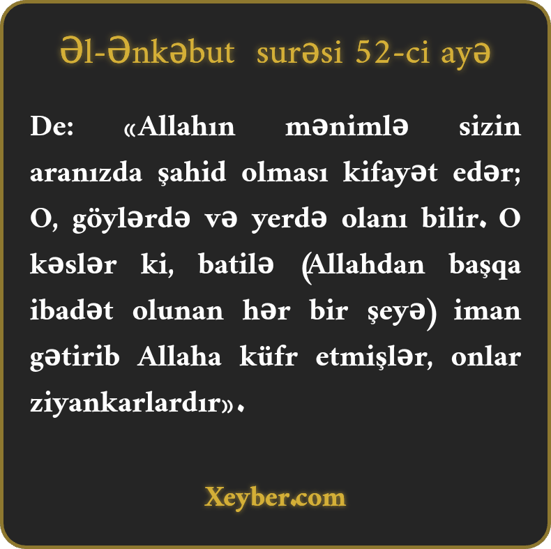 De: «Allahın mənimlə sizin aranızda şahid olması kifayət edər; O, göylərdə və yerdə olanı bilir. O kəslər ki, batilə (Allahdan başqa ibadət olunan hər bir şeyə) iman gətirib Allaha küfr etmişlər, onlar ziyankarlardır».
