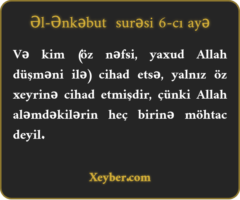 Və kim (öz nəfsi, yaxud Allah düşməni ilə) cihad etsə, yalnız öz xeyrinə cihad etmişdir, çünki Allah aləmdəkilərin heç birinə möhtac deyil.
