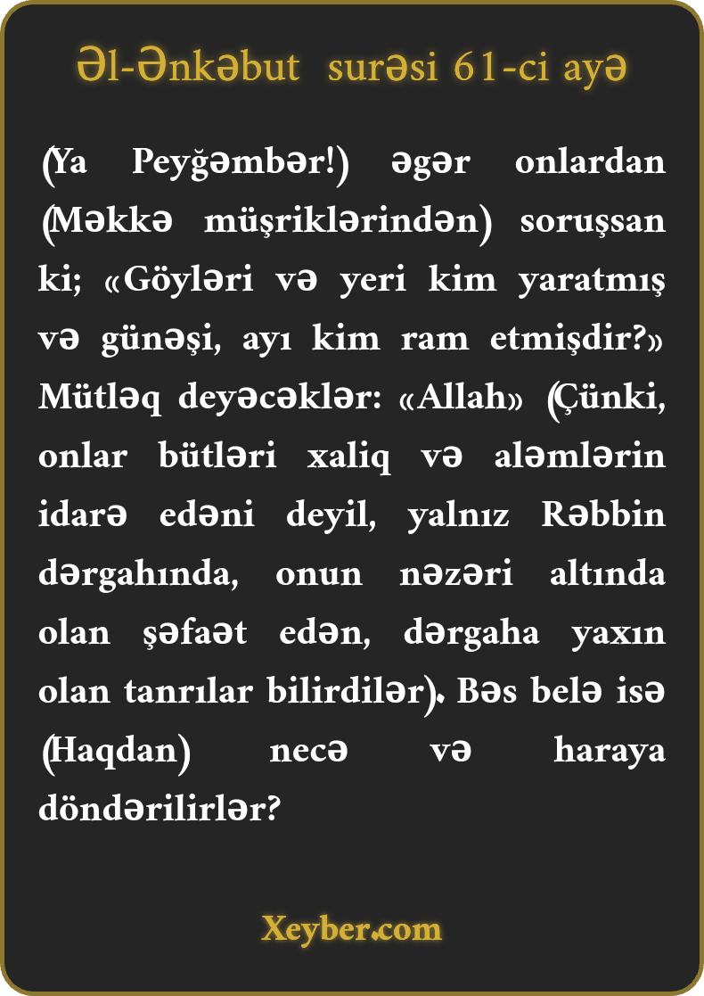 (Ya Peyğəmbər!) əgər onlardan (Məkkə müşriklərindən) soruşsan ki; «Göyləri və yeri kim yaratmış və günəşi, ayı kim ram etmişdir?» Mütləq deyəcəklər: «Allah» (Çünki, onlar bütləri xaliq və aləmlərin idarə edəni deyil, yalnız Rəbbin dərgahında, onun nəzəri altında olan şəfaət edən, dərgaha yaxın olan tanrılar bilirdilər). Bəs belə isə (Haqdan) necə və haraya döndərilirlər?