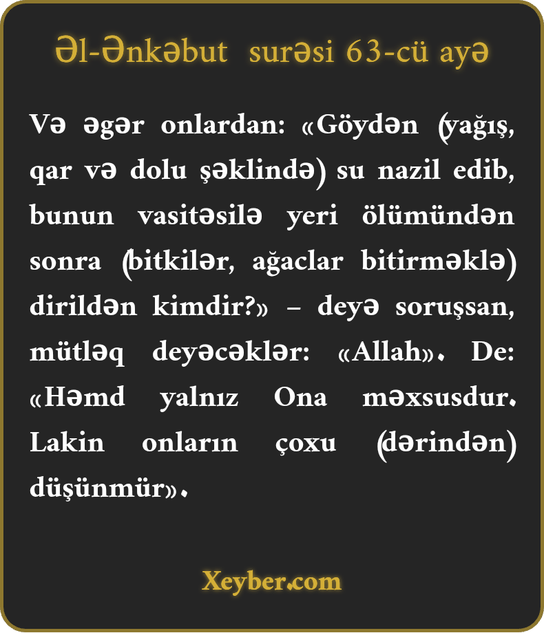 Və əgər onlardan: «Göydən (yağış, qar və dolu şəklində) su nazil edib, bunun vasitəsilə yeri ölümündən sonra (bitkilər, ağaclar bitirməklə) dirildən kimdir?» – deyə soruşsan, mütləq deyəcəklər: «Allah». De: «Həmd yalnız Ona məxsusdur. Lakin onların çoxu (dərindən) düşünmür».