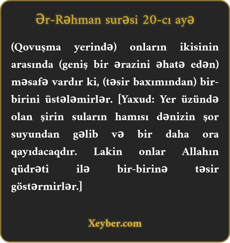 (Qovuşma yerində) onların ikisinin arasında (geniş bir ərazini əhatə edən) məsafə vardır ki, (təsir baxımından) bir-birini üstələmirlər. [Yaxud: Yer üzündə olan şirin suların hamısı dənizin şor suyundan gəlib və bir daha ora qayıdacaqdır. Lakin onlar Allahın qüdrəti ilə bir-birinə təsir göstərmirlər.]