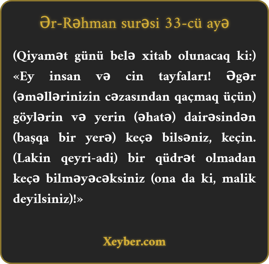 (Qiyamət günü belə xitab olunacaq ki:) «Ey insan və cin tayfaları! Əgər (əməllərinizin cəzasından qaçmaq üçün) göylərin və yerin (əhatə) dairəsindən (başqa bir yerə) keçə bilsəniz, keçin. (Lakin qeyri-adi) bir qüdrət olmadan keçə bilməyəcəksiniz (ona da ki, malik deyilsiniz)!»