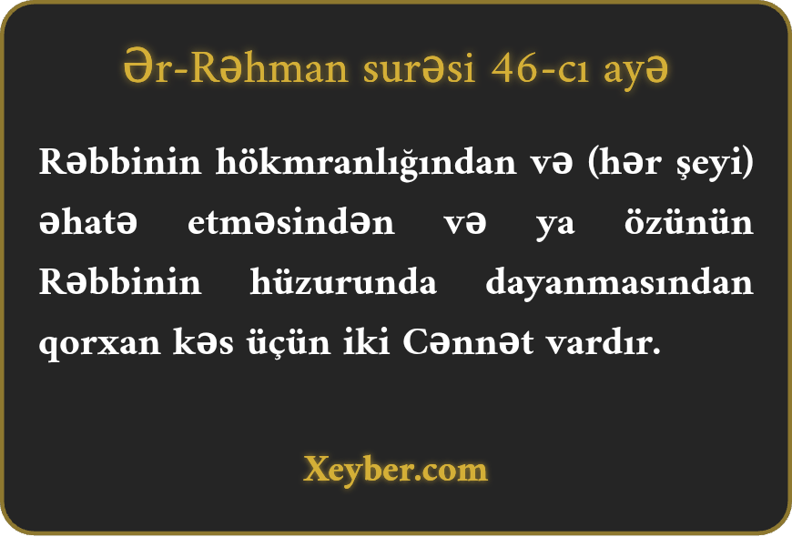 Rəbbinin hökmranlığından və (hər şeyi) əhatə etməsindən və ya özünün Rəbbinin hüzurunda dayanmasından qorxan kəs üçün iki Cənnət vardır.